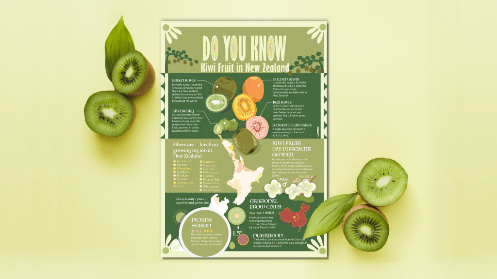 A2 information visualization Poster: 10 facts of kiwi fruit in New Zealand.